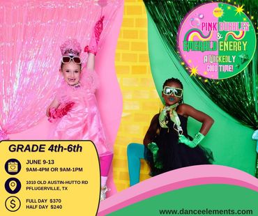 Each camp week we cover multiple styles of dance including ballet, tap, jazz, acro, contemporary, and hip hop. There is a full day camp option where dancers stay until 4:00pm. The focus shifts from dance to activities that keep the kids engaged and moving in the afternoon. Tuesday and Thursday are swim days; we walk over to Scott Mentzer pool on those days. Monday and Wednesday afternoons we will do additional dance/PBT/strenghtening classes in the afternoon. On Friday afternoon we finish up with a movie and pizza party in the afternoon; that takes place in the studio.